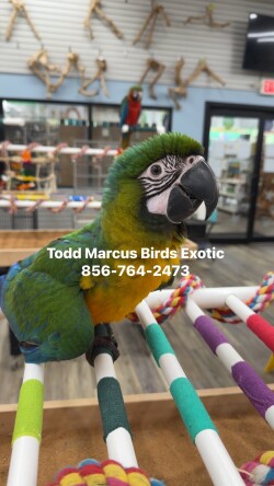 Currently handfeeding is a stunning Miligold Macaw! Super sweet baby and will be a nice large bird! Miligolds are fantastic hybrids between a Military X Blue & Gold. Here at Todd Marcus Birds Exotic, we have over 40 years of experience raising the happiest & healthiest baby birds. We are conveniently located in Delran, NJ which is just outside of Philadelphia. We are open 7 days a week, Monday-Saturday from 9am-8pm and Sunday 10am-5pm. Our store has everything you need from Cages, Food, Toys, & more! Check out our website Thebirdstore.com if you can’t make it in and have your supplies shipped to you! We ship birds throughout the country with Delta, American, or Alaska Airlines Cargo.