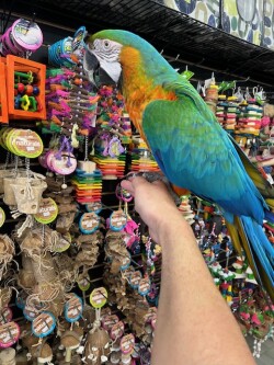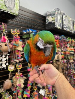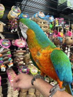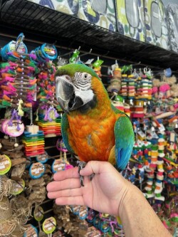 Hand tame beautiful Catalina Macaw Hybrid adult dna tested female, this is a cross between a Blue & Gold Macaw and a Scarlett Macaw making this beautiful and colorful Hybrid Macaw. For more info call 773-317-3785.