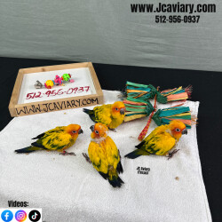 Accepting reservations on these beautiful HIGH-YELLOW sun conure babies. They are now being hand-fed and trained.They will be weaned on a healthy diet of organic pellets and vegetables. All our babies are Extremely sweet and very well socialized. Please see our website for detailed info! For all inquiries please call-- 512-956-0937