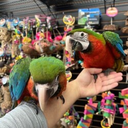 Currently hand feeding is a sweet baby dna tested female Harlequin Macaw Hybrid. This is a cross between a Green wing Macaw and a Blue & Gold Macaw making a sweet tempered and friendly Hybrid Macaw. For more info call 773-317-3785.