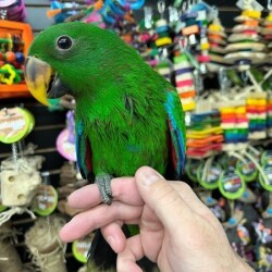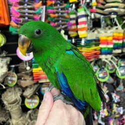 Currently hand feeding is a sweet baby Solomon Island Eclectus male. For more info call 773-317-3785.