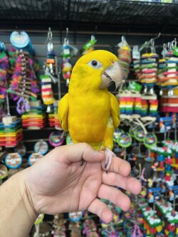 Very sweet and tame hand fed 2025 hatch Golden Conure available. This baby is super sweet and fully flighted and loves to fly on you gives cuddles and loves neck scratches. For more info call 773-317-3785.