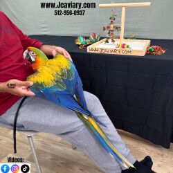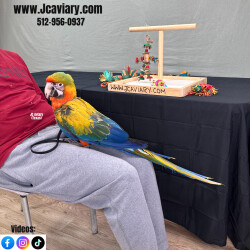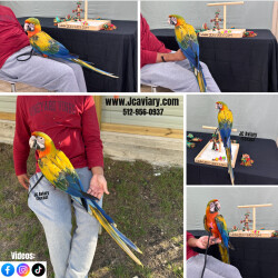 Incredibly sweet, tame, hand-fed and fully trained camelot macaw baby ready now for her forever homes. She is weaned on a healthy diet of organic pellets, veg and mixed nuts. All our babies are sweet and very socialized. Please see our website for detailed information! For inquiries please call-- 512-956-0937