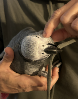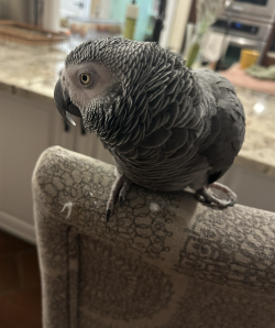 Ducky the congo grey is a really kind and gentle soul. We have found that when birds have special needs they tend to be puppy dog tame as they need a bit of help to get around from Time to time. Ducky loves the ladies and loves to watch people make dinner!