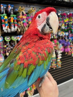 Very sweet and tame dna tested female baby Green Wing Macaw available weaned and ready for its new home. For more info call 773-317-3785. We are located at 710 Lee St., Des Plaines, IL 60016.