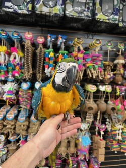 Hand fed very sweet and tame dna tested female Blue & Gold Macaw weaned and ready for its new home. For more info call 773-317-3785. We are located at 710 Lee St. Des Plaines Il 60016.