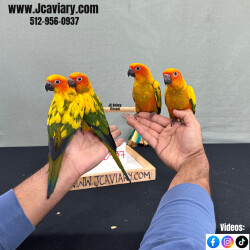 Incredibly sweet and fully trained sun conure babies ready now for their forever homes. They are weaned on a healthy diet of organic pellets, veg and mixed nuts. All our babies are sweet and very socialized. Please see our website for detailed info! For all inquiries please call-- 512-956-0937