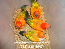 Baby red factor Sun Conures available at $550 each. Multi-purchase discount available