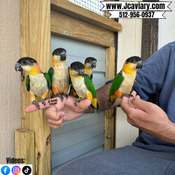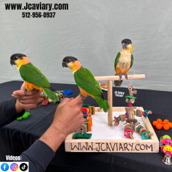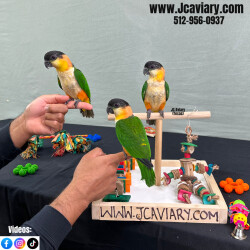 Incredibly sweet, tame, hand-fed and trained black-headed caique babies ready now for their forever homes. These babies are weaned on a healthy diet of organic pellets, veg and mixed nuts. All our babies are sweet and very socialized. Please see our website 4 detailed info! For inquiries please call-- 512-956-0937