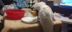Male tame 8 years old, talks and does a lot of sounds. Loves to be scratched. Needs a experience handler