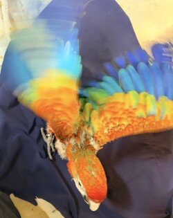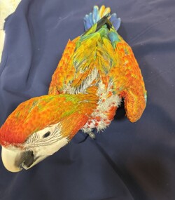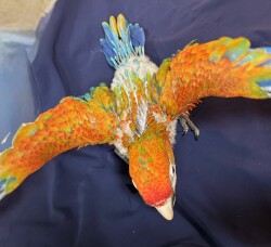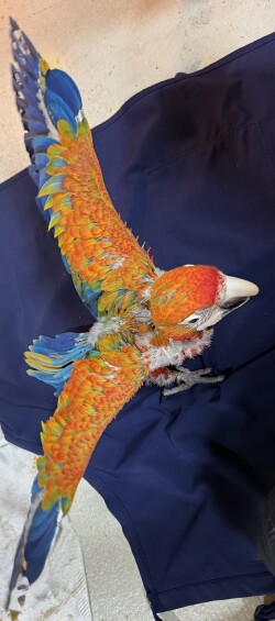 Baby flame macaw hatch 2/23/2026. DNA sexed female, disease tests negative, and veterinarian heath certification included. Located in Groves, Tx 77619. Text for more information (409)549-151one.