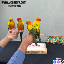 Incredibly sweet and fully trained sun conure babies ready now for their forever homes. They are weaned on a healthy diet of organic pellets, veg and mixed nuts. All our babies are sweet and very socialized. Please see our website for detailed info! For all inquiries please call-- 512-956-0937