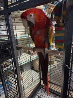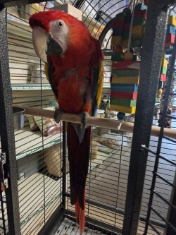 Beautiful 2.5 year old scarlet female. Very sweet. Loving bird. Speaks English and Spanish