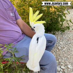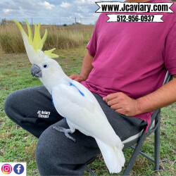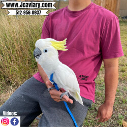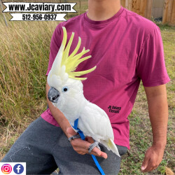 Incredibly sweet, tame, and hand-fed Sulphur crested cockatoo baby ready now for his forever home. He is on a healthy diet of organic pellets, veg and mixed nuts. All our babies are sweet and very socialized. Please see our website 4 detailed info! For inquiries please call-- 512-956-0937