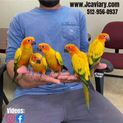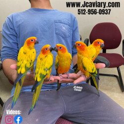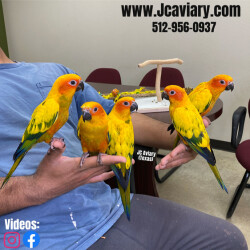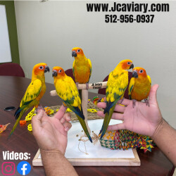 Incredibly sweet and fully trained sun conure babies ready now for their forever homes. They are weaned on a healthy diet of organic pellets, veg and mixed nuts. All our babies are sweet and very socialized. Please see our website for detailed info! For all inquiries please call-- 512-956-0937
