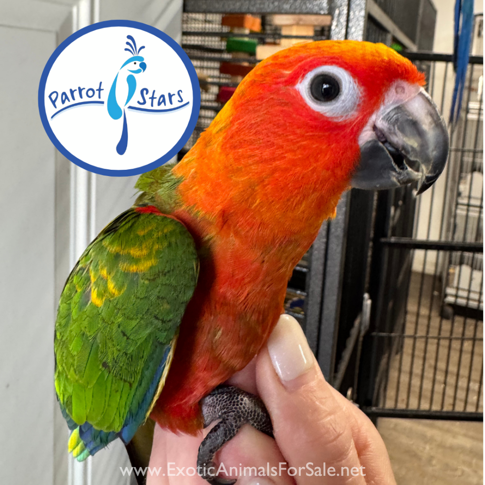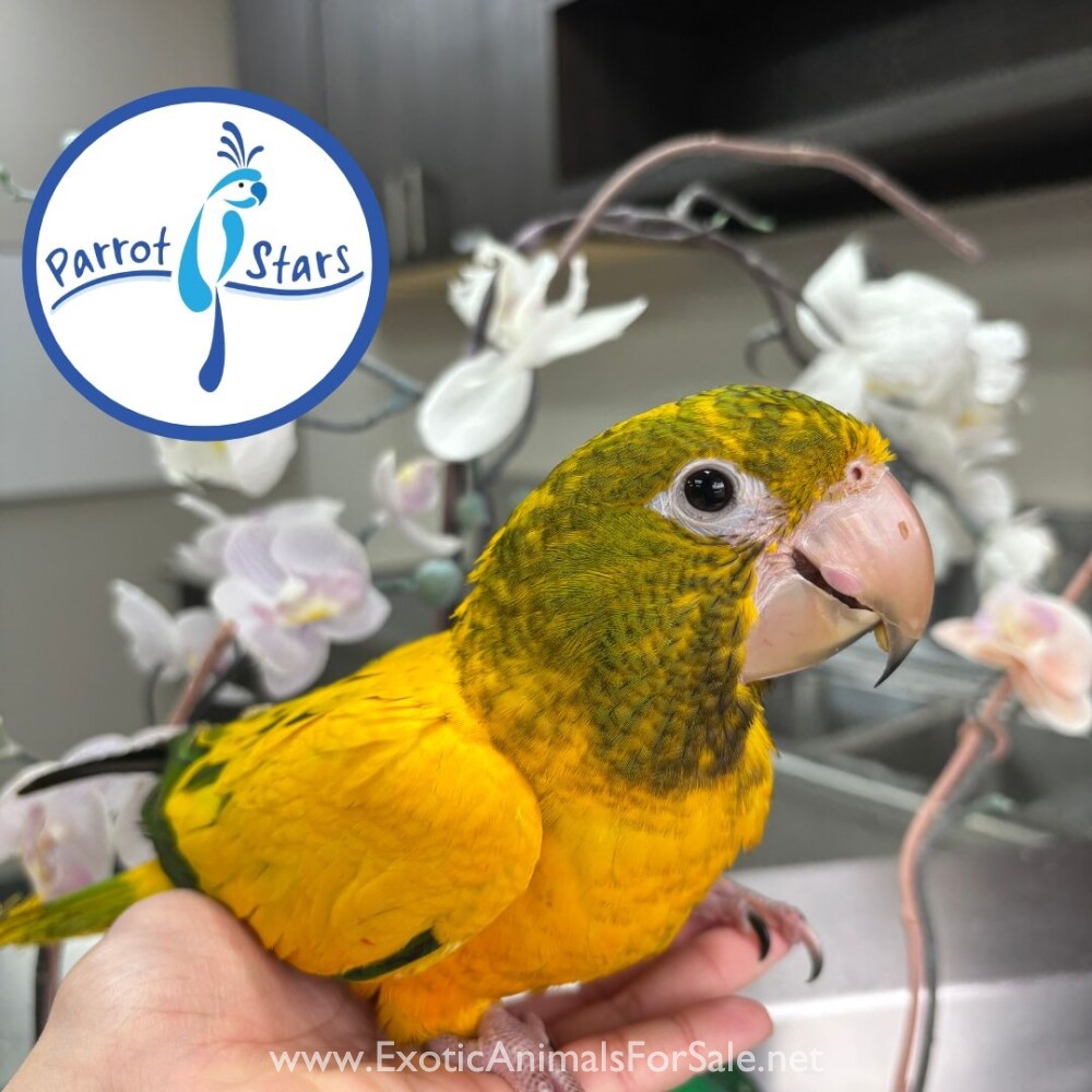 Scientific Name: Aratinga jandaya Native Range: South America The Jenday Conure, very similar to the Sun Conure, is a small sized parrot species within the family Psittacidae. It is characterized by a bright orange-yellow head and body, green wings...