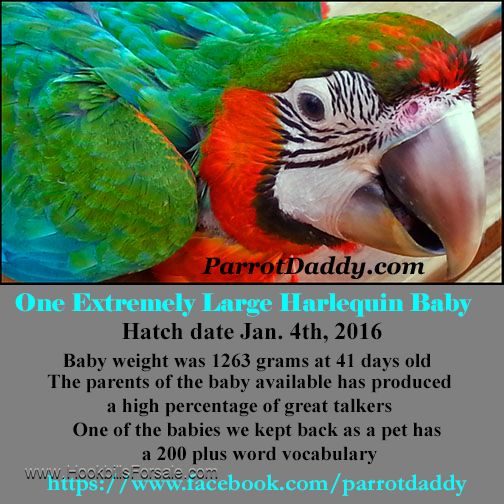 Exotic Harlequin Macaw Handfed Baby for Sale. 1850.00 Hatch date Jan.4th,2016 We used the absolute largest specimen breeding stock available. The Massive Green-Winged Macaw (Ara chloroptera) x Blue & Gold ( Ara ararauna) utilized makes for a very...