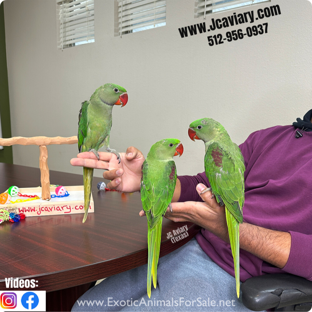 Incredibly sweet, tame, hand-fed and trained Alexandrine babies ready now for their forever homes. These babies are weaned on a healthy diet of organic pellets, veg and mixed nuts. All our babies are sweet and very socialized. Please see our website...