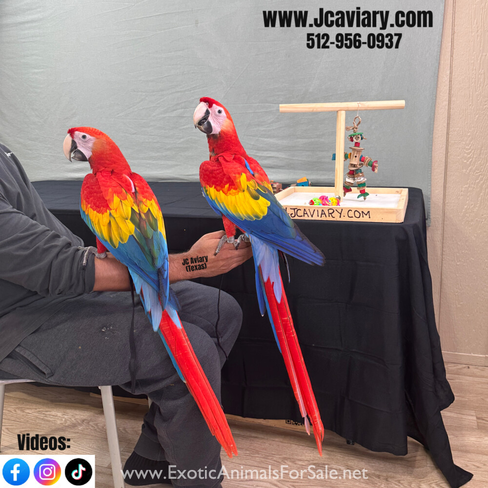 Incredibly sweet, tame, hand-fed and fully trained Scarlet macaw babies ready now for their forever homes. These babies are on a healthy diet of organic pellets, veg and mixed nuts. All our babies are sweet and very socialized. Please see our website...