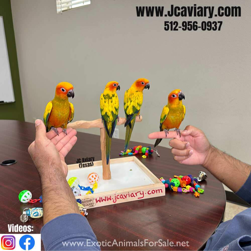 Incredibly sweet and fully trained sun conure babies ready now for their forever homes. They are weaned on a healthy diet of organic pellets, veg and mixed nuts. All our babies are sweet and very socialized. Please see our website for detailed info!...
