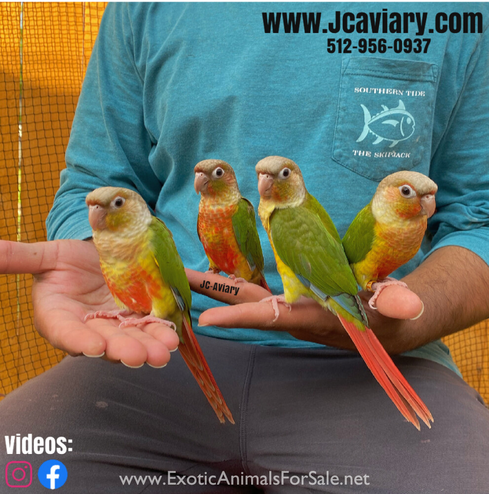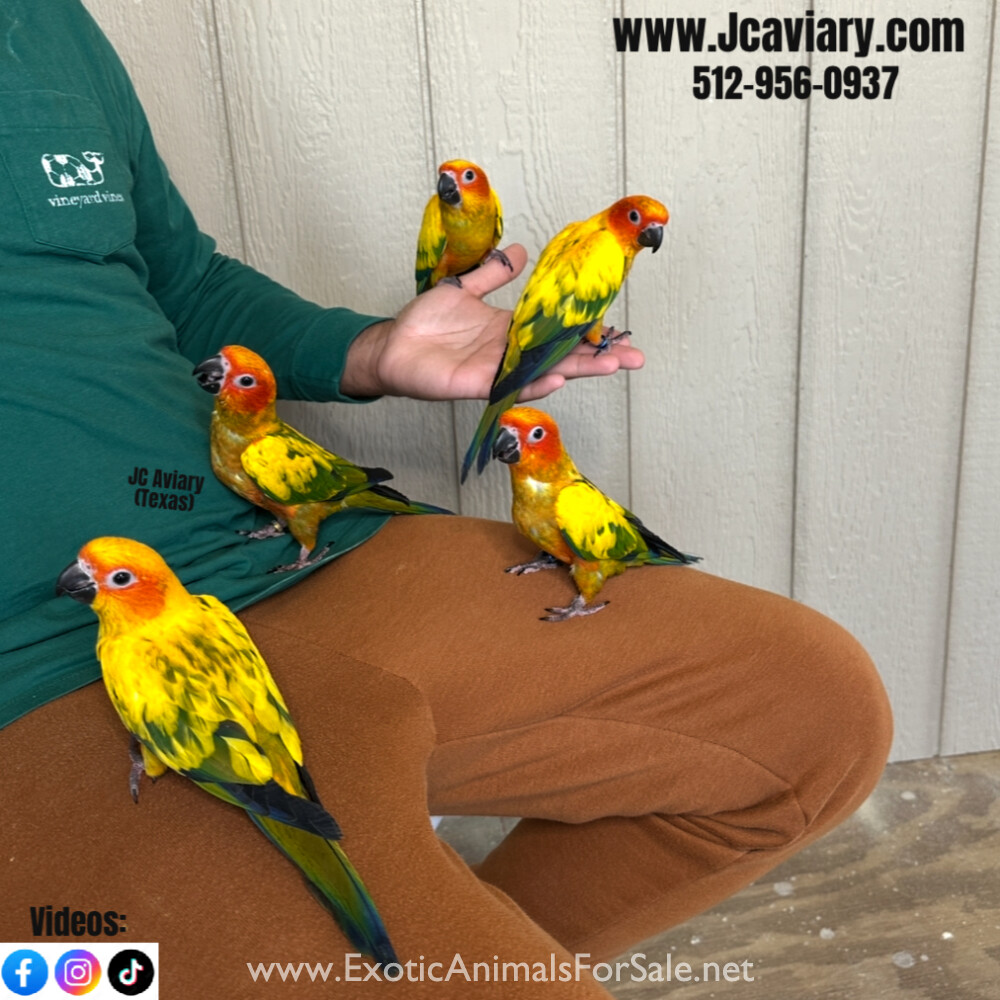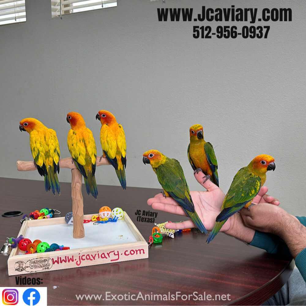 Incredibly sweet and fully trained sun conure babies ready now for their forever homes. They are weaned on a healthy diet of organic pellets, veg and mixed nuts. All our babies are sweet and very socialized. Please see our website for detailed info!...