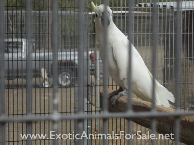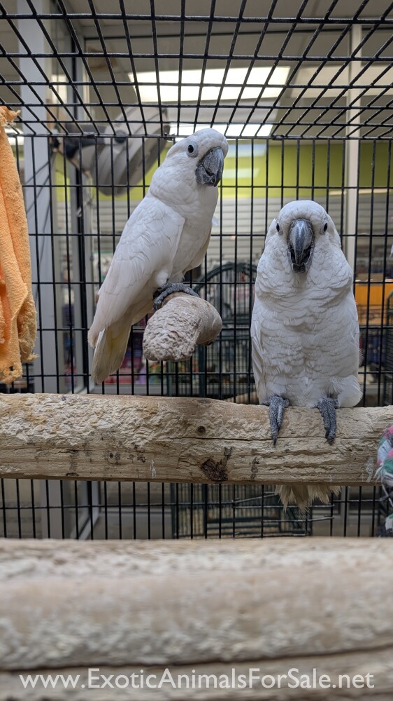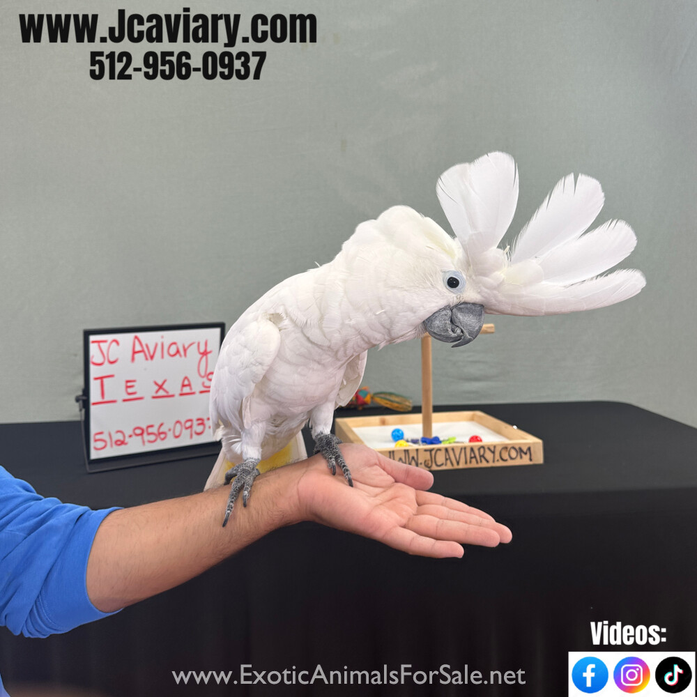 This is a sweet and tame Mobrella Cockatoo Hybrid adult female which is a cross between a Moluccan Cockatoo and a Umbrella Cockatoo making this beautiful and sweet tempered Cockatoo Hybrid.