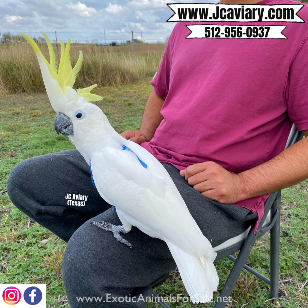 Incredibly sweet, tame, and hand-fed Sulphur crested cockatoo baby ready now for his forever home. He is on a healthy diet of organic pellets, veg and mixed nuts. All our babies are sweet and very socialized. Please see our website 4 detailed info! F...