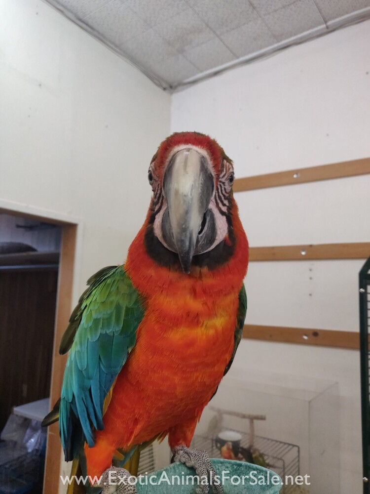 Hand tame beautiful Catalina Macaw Hybrid adult dna tested female, this is a cross between a Blue & Gold Macaw and a Scarlett Macaw making this beautiful and colorful Hybrid Macaw. For more info call 773-317-3785.
