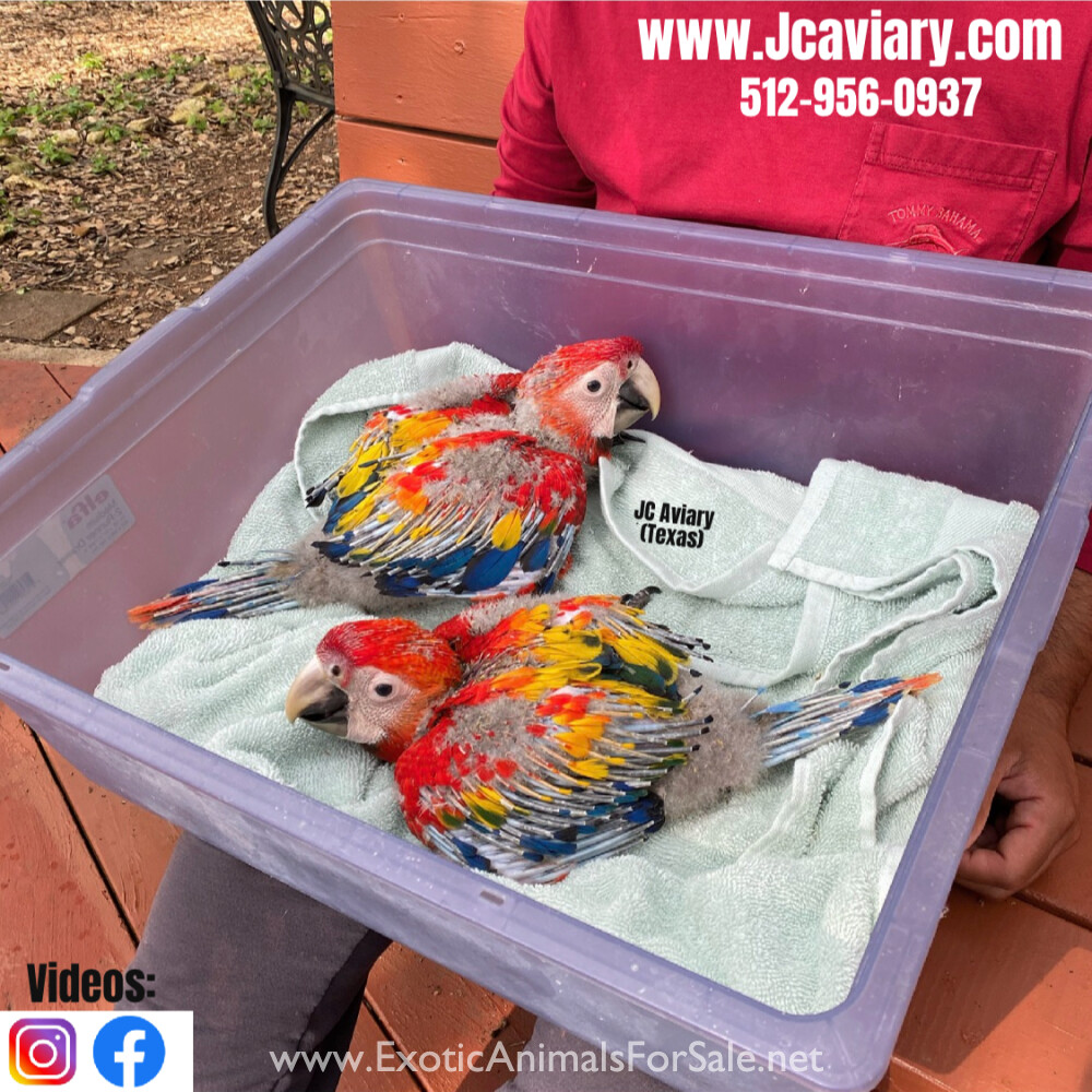 Accepting reservations on these 2 adorable Scarlet macaw babies. They are currently being hand-fed and will eventually be fully trained by us as well. They will be on a healthy diet of organic pellets and vegetables. All our babies are sweet and very...