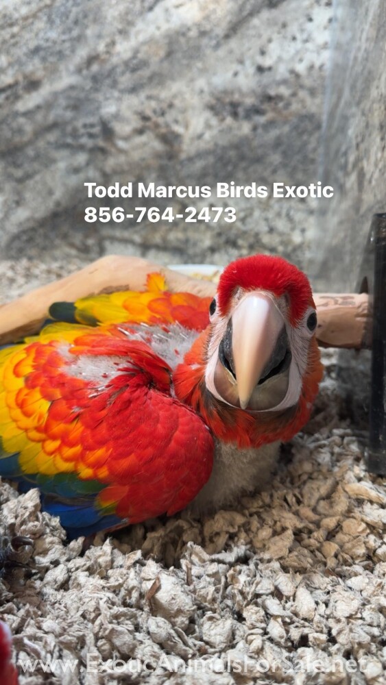 1 Scarlet Macaw Available. So sweet and so beautiful. Here at Todd Marcus Birds Exotic, we have over 40 years of experience raising the happiest & healthiest baby birds. We are conveniently located in Delran, NJ which is just outside of Philadelphia....