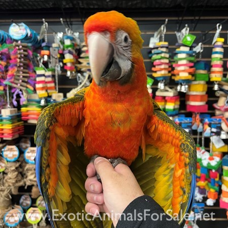 Currently hand feeding is a sweet baby dna tested female Harlequin Macaw Hybrid. This is a cross between a Green wing Macaw and a Blue & Gold Macaw making a sweet tempered and friendly Hybrid Macaw. We offer financing go to birdmansparrots.com and ap...