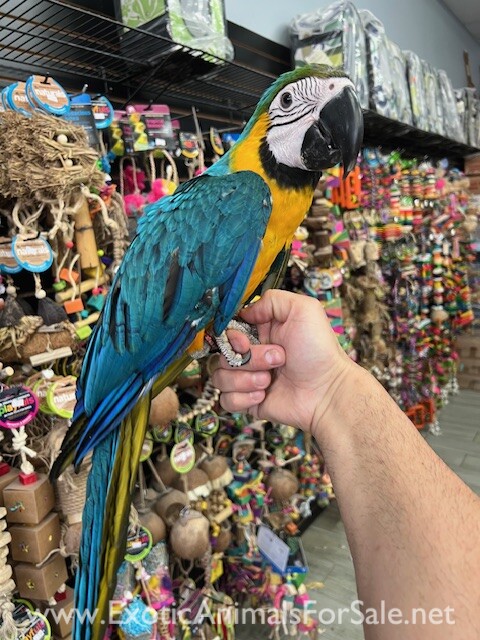 Hand fed very sweet and tame dna tested female Blue & Gold Macaw weaned and ready for its new home. We offer financing go to birdmansparrots.com and apply today or call 773-317-3785.