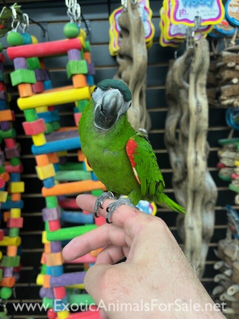 Hahns Mini Macaw named "ROBIN" he is tame and friendly but will take time to warm up to new person does talk and mimic sounds. WE DO SHIP!!! We offer shipping go to birdmansparrots.com and apply today or call 773-317-3785.