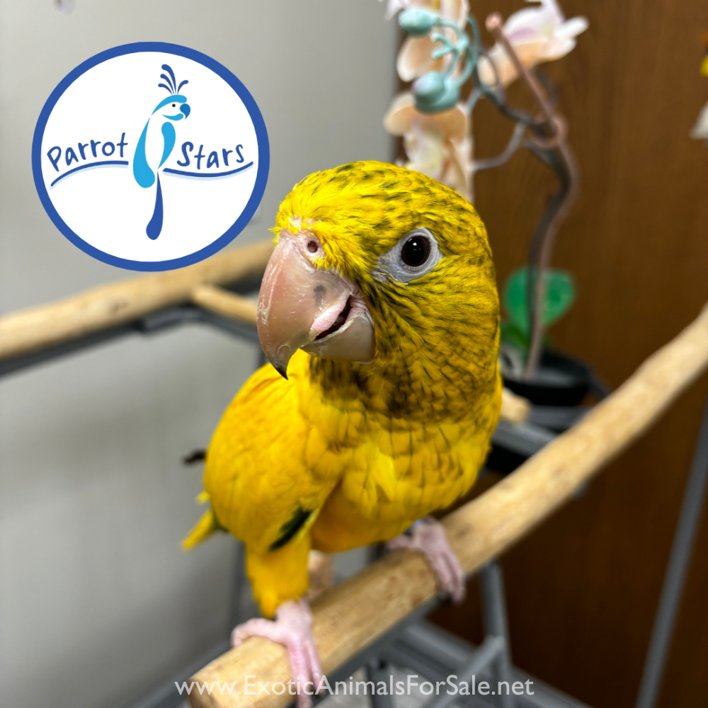 "Scientific Name: Aratinga solstitialis Native Range: South America The Sun Conure, also known as the Sun Parakeet, is a small sized parrot species within the family Psittacidae. It is characterized by vibrant yellow plumage with orange and red co...